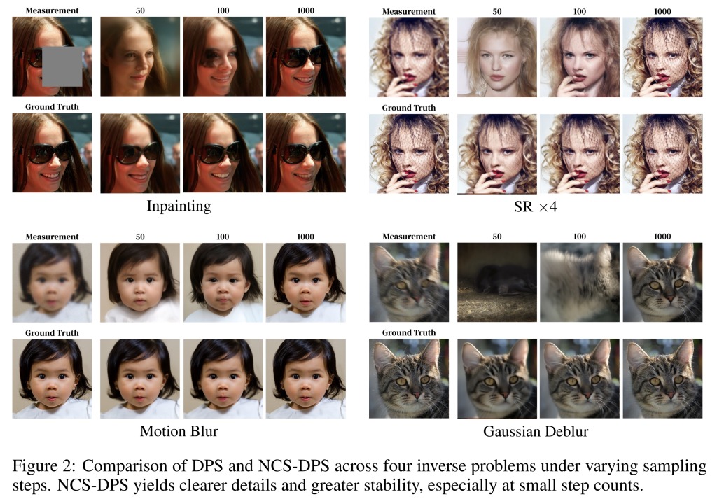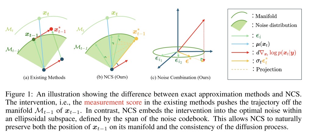 - Abstract: Pretrained diffusion models have demonstrated strong capabilities in zero-shot inverse problem solving by incorporating observation information into the generation process of the diffusion models. However, this presents an inherent dilemma: excessive integration can disrupt the generative process, while insufficient integration fails to emphasize the constraints imposed by the inverse problem. To address this, we propose Noise Combination Sampling, a novel method that synthesizes an optimal noise vector from a noise subspace to approximate the measurement score, replacing the noise term in the standard Denoising Diffusion Probabilistic Models process. This enables conditional information to be naturally embedded into the generation process without reliance on step-wise hyperparameter tuning. Our method can be applied to a wide range of inverse problem solvers, including image compression, and, particularly when the number of generation steps T is small, achieves superior performance with negligible computational overhead, significantly improving robustness and stability..